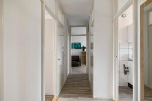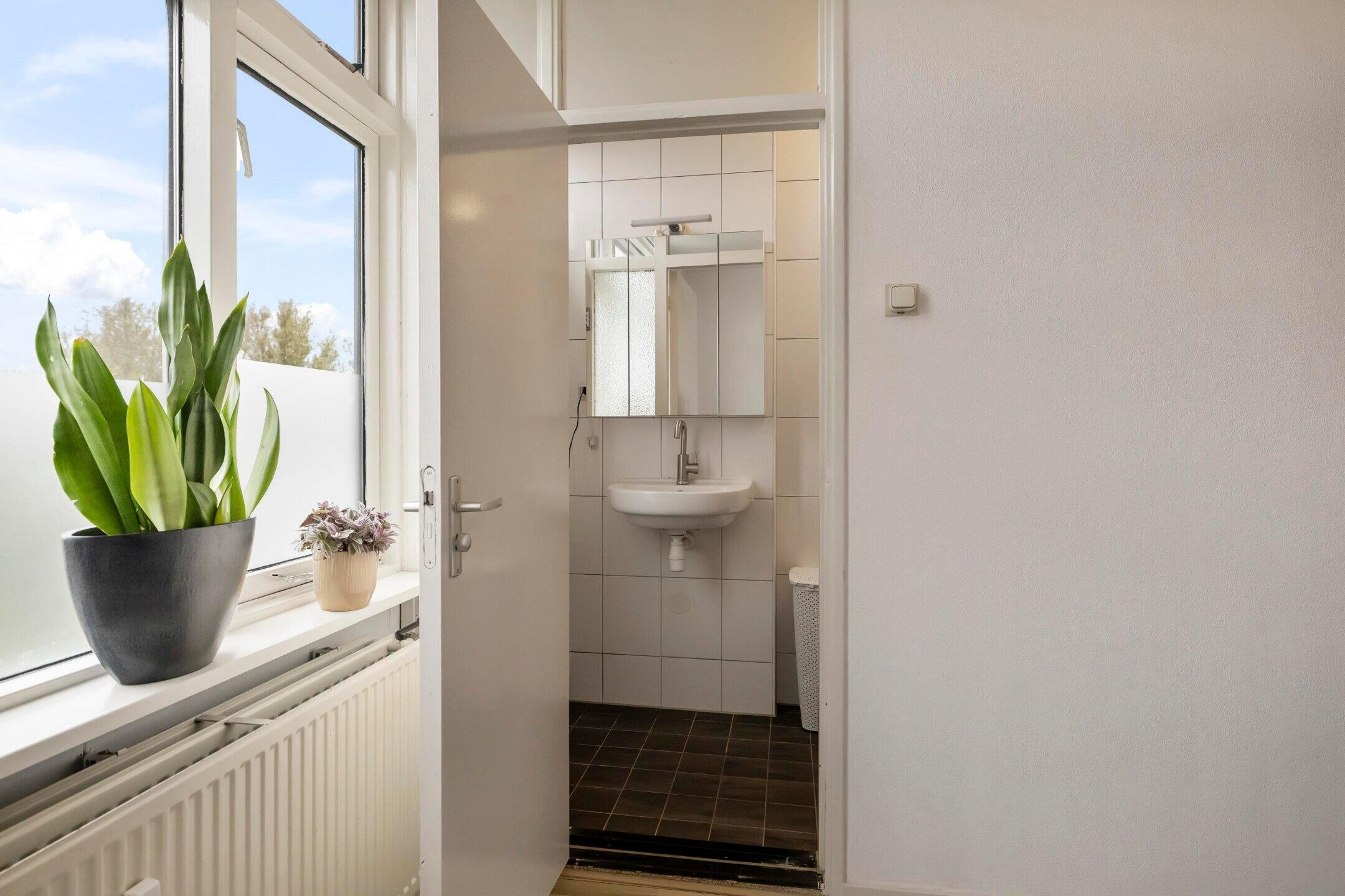 Entree, hal met inbouwkast, meterkast en toilet met fonteintje.